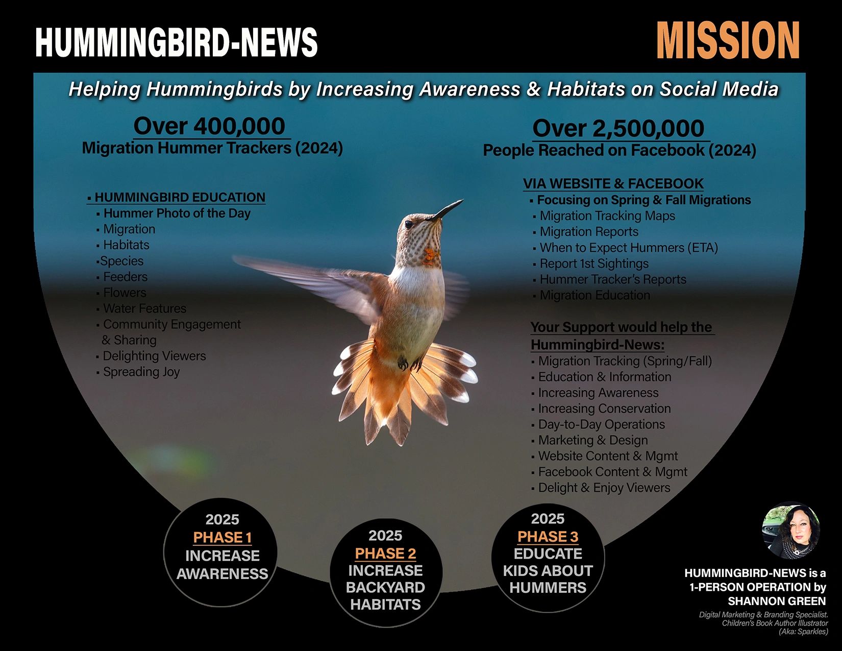 Mission: Create a Happy Hummingbird Community that Connects, Inspires & Engages People of all Ages & Backgrounds. The Hummingbird-News Facebook page reaches over 1,400,000 people yearly. Delivering Captivating Content & useful Information that Delights the Viewers & Helps Increase Hummingbird Awareness & Conservation.